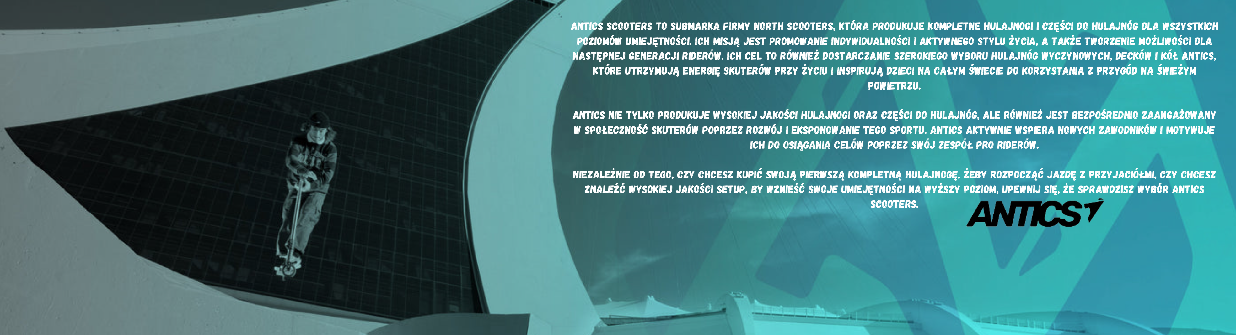 - Výkonná koloběžka Antics zaměřená na park s úzkou a lehkou palubou, která se snadno zvedá a velmi dobře reaguje ve vzduchu
